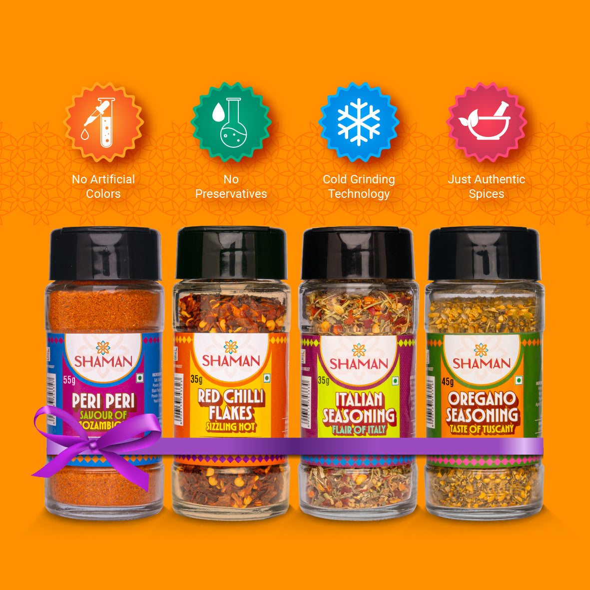 • Complete Continental Flavour Pack: Includes Oregano, Chilli Flakes, Peri Peri Spice, and Italian Seasoning for a full range of herby, spicy, tangy, and savoury flavours.